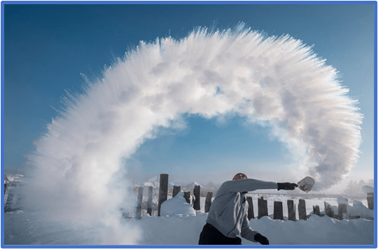 If you want to try this, please be careful! – The Hot Water should be as close to Boiling at 212°F / 100°C and the Outdoor Temperature needs to be -25°F / -32°C or colder, or it won’t work. And of course be mindful of the direction the wind is blowing in!