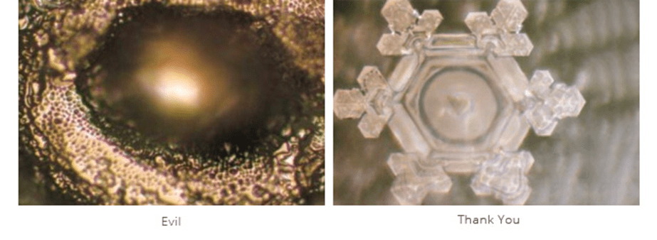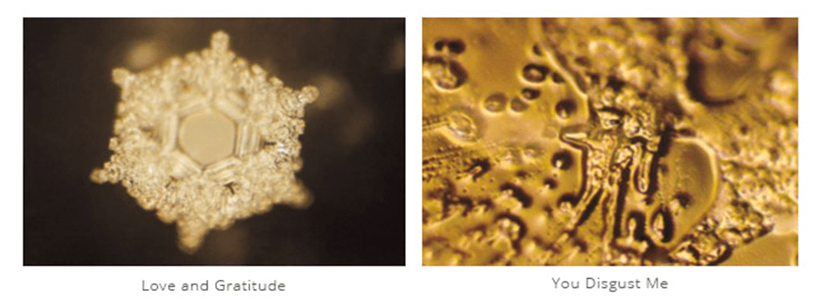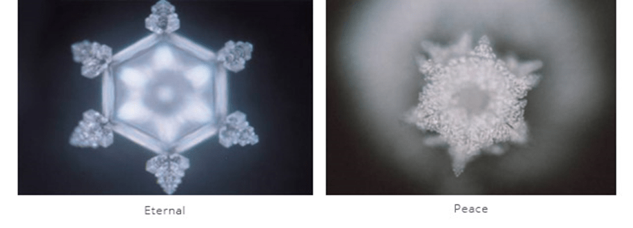 In his first book he uses his research and high exposure photography to visually demonstrate the structure of frozen water molecules after being exposed to changes in their environment, specifically, vibrations through the emotions and sounds of the spoken word and music. Some of the photographic results can be seen below with the related spoken words noted underneath each image: