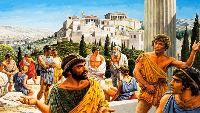We skip forward to 407 BC and a bright sunny day in Athens. In the background is the now completed Acropolis, which means High City, and a group of men are gathered around. Two men in white togas stand talking in discussion. The one with the beard is Socrates, which means Love of Learning’ and the other is his friend Plato.