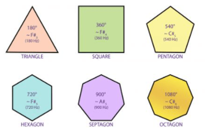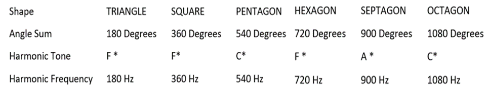 The Sonic Polygons derive from the Triangle, Square, Pentagon, Hexagon, Heptagon and the Octagon, as shown below and against their corresponding Tone and Frequency.