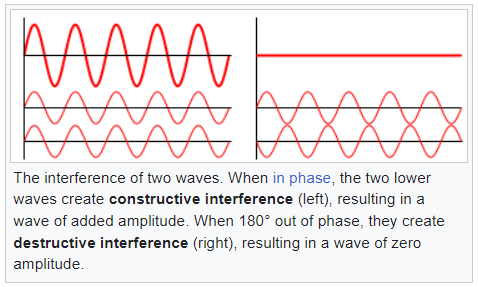 The resulting final wave might have a Constructive Interference which would be a greater intensity, or it might have a Destructive Interference which would be a lower amplitude, and dependant on if the two waves are in phase or out of phase with each other {see above image}.